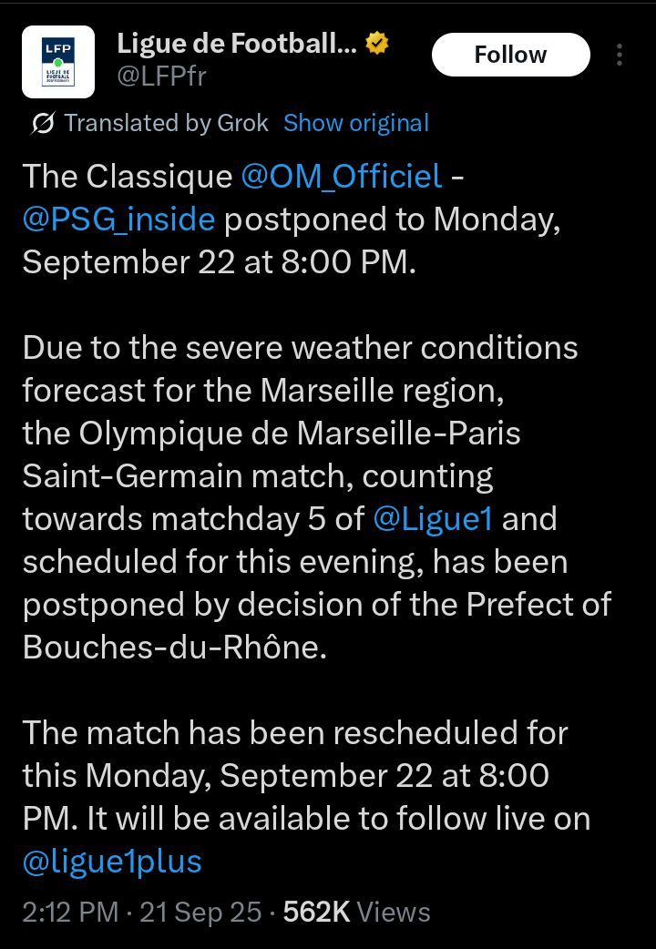 Ligue 1 regulations require that postponed fixtures be played the following day. The league confirmed that PSG will face Marseille on Monday, October 22, at 8pm (WAT).