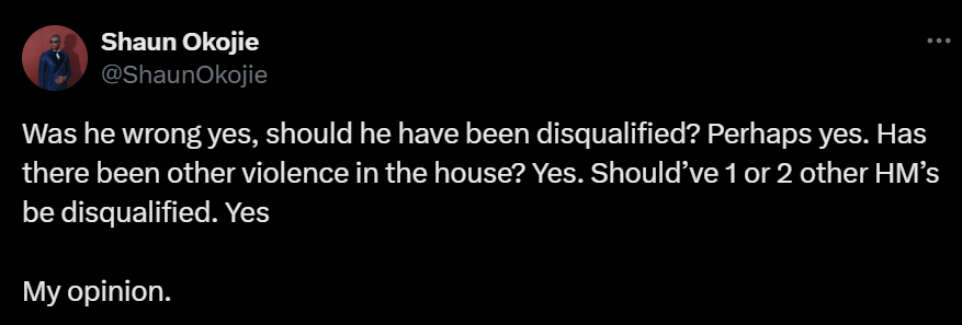 Former housemate Pere Egbi first posted on X: “Two of them were wrong.” before adding:
