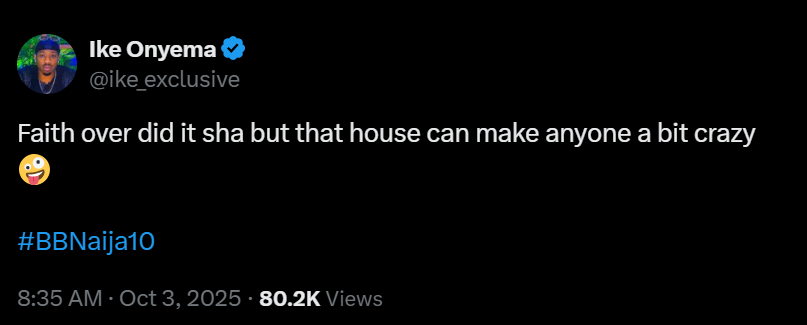 Former BBNaija star Ik Onyema wrote: “Faith overdid it sha, but that house can make anyone a bit crazy.”