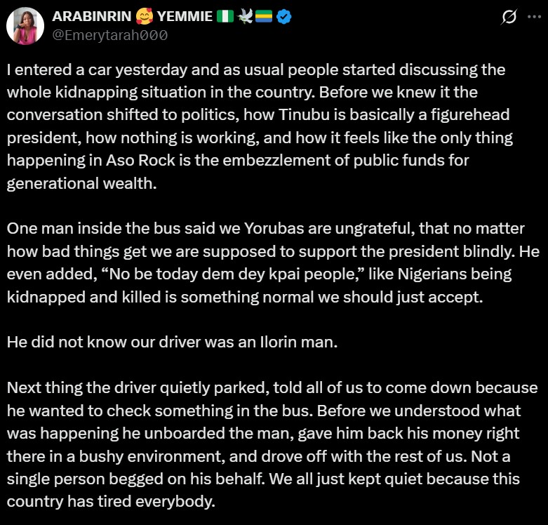 A Nigerian lady has shared a story on X (Twitter) about how a bus driver dumped a passenger mid-trip for making an insensitive remark about the insecurity in the country.