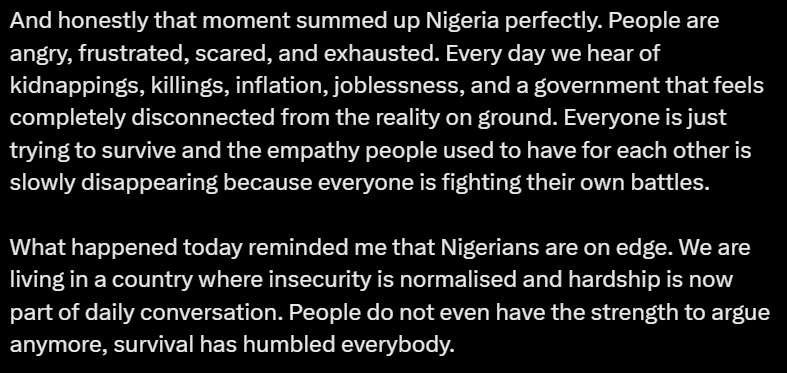 Reflecting on the incident, she said the moment captured the frustration, fear, and emotional exhaustion many Nigerians feel as insecurity, inflation, unemployment, and daily hardship continue to affect lives.