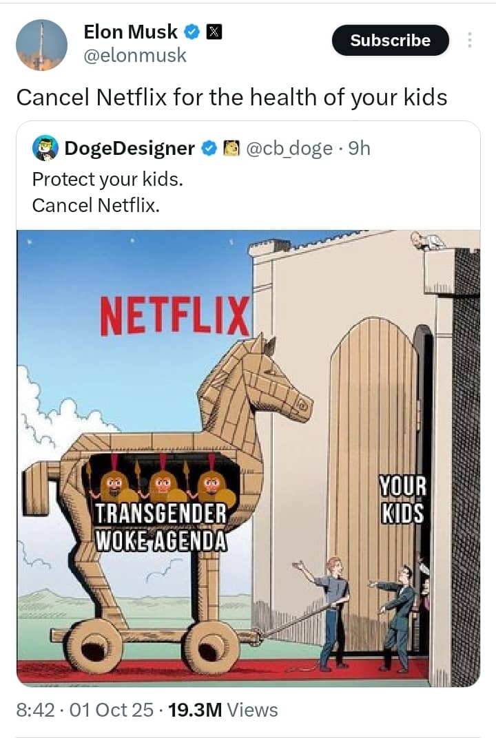The controversy over the animated series is, therefore, seen by many as the “final straw” in a company-wide trend, confirming Musk’s long-held view that Netflix prioritises social messaging, such as the promotion of transgenderism in America, over pure entertainment value, making it a recurring target of his cultural and political commentary.