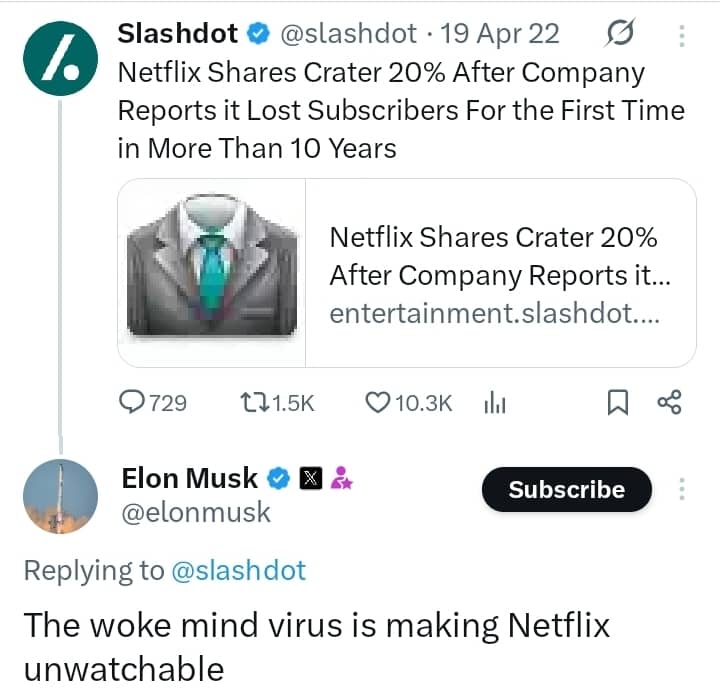 His first major public critique came in April 2022, when Netflix reported a significant loss of subscribers for the first time in over a decade. Musk seized the moment, tweeting that the “woke mind virus” was a key factor in the company’s struggles.