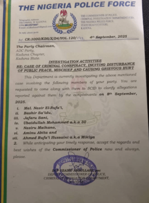 A police invitation letter dated September 4, 2025, and signed by the Deputy Commissioner of Police in charge of the Criminal Investigation Department (CID), Uzainu Abdullahi, directed the ADC state chairman to produce the invited individuals at the State CID on September 8, 2025.