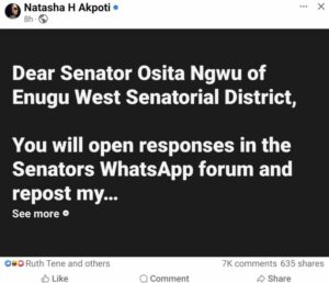 In the post, she wrote, “Dear Senator Osita Ngwu of Enugu West Senatorial District, You will open responses in the Senators WhatsApp forum and repost my deleted comments. Else I’ll bring the discussion to the public domain.”
