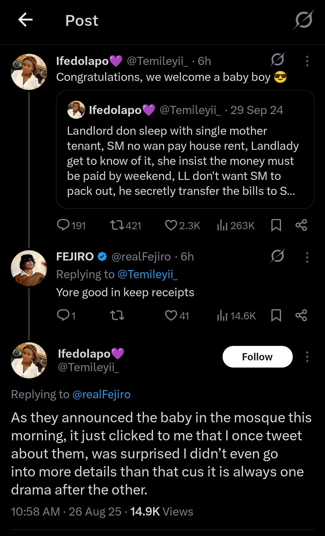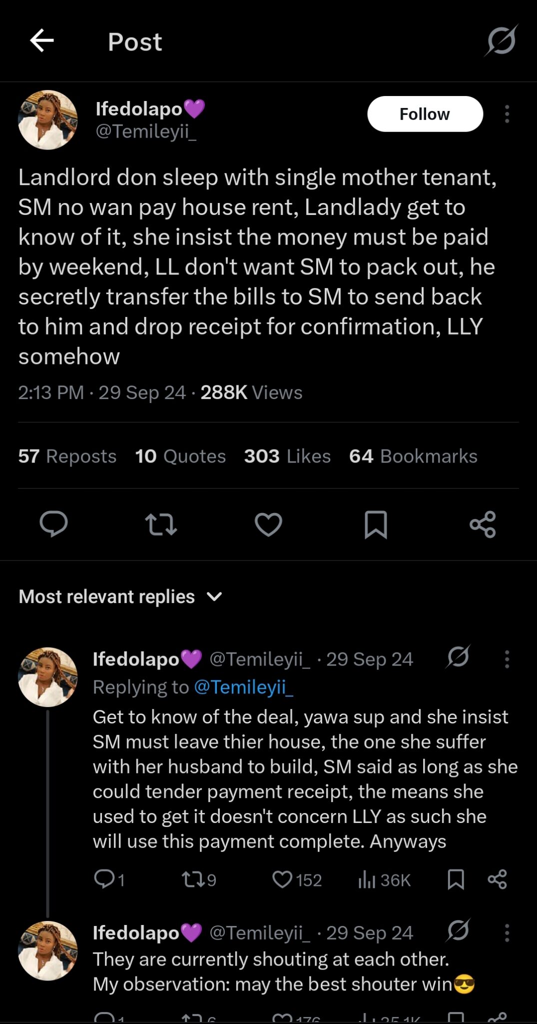 The story shared by the user read: “Landlord don sleep with single mother tenant, SM no wan pay house rent, Landlady get to know of it, she insist the money must be paid by weekend, LL don’t want SM to pack out, he secretly transfer the bills to SM to send back to him and drop receipt for confirmation, LLY somehow.”